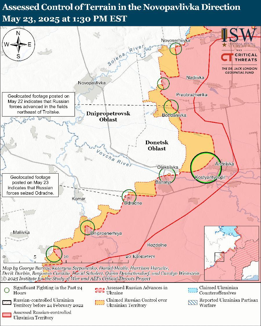 Оценка российского продвижения: геолоцированные кадры, опубликованные 23 мая, указывают на то, что российские войска недавно продвинулись к северо-востоку от Троицкого (к юго-востоку от Новопавловки). [58]