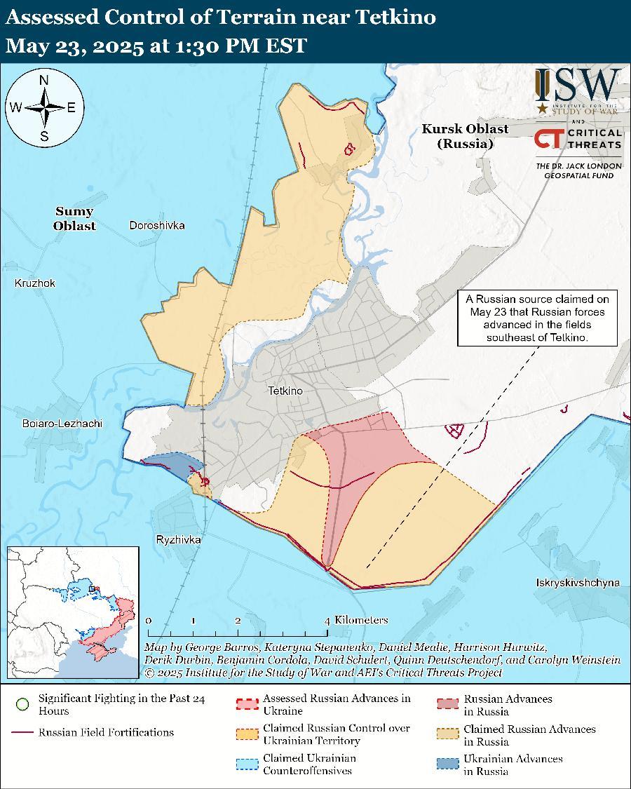 23 мая российские войска продолжили ограниченные наступательные действия на севере Сумской области, но не добились подтвержденных успехов.
