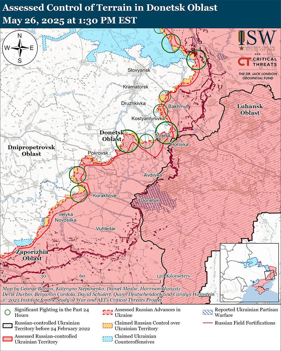 За последние три дня Россия нанесла три крупнейших удара по Украине, в том числе два крупнейших комбинированных удара и восемь крупнейших ударов войны с января 2025 года. [3] Российские удары по Украине продолжают наносить непропорционально большой ущерб мирным жителям и гражданской инфраструктуре. [4] Президент Украины Владимир Зеленский заявил 26 мая, что за последние три дня Россия запустила более 900 беспилотников против Украины и что усиление российских ударов имеет значительный политический смысл. [5] Зеленский заявил, что президент России Владимир Путин предпочитает продолжать войну, а не участвовать в значимых мирных переговорах, и что нет никаких доказательств того, что Россия рассматривает возможность дипломатического прекращения войны. [6] Россия, возможно, наращивает удары по Украине в рамках когнитивной войны, направленной на ослабление решимости Украины и подрыв западной поддержки Украины.