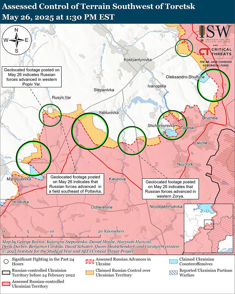 Оценка российского продвижения: геолоцированные кадры, опубликованные 26 мая, указывают на то, что российские войска в последнее время незначительно продвинулись в центре Попового Яра и в полях к юго-востоку от Полтавки (оба к западу от Торецка). [71] На дополнительных геолоцированных кадрах, опубликованных 26 мая, видно, как российские войска вступают в бой с мирными жителями в Заре (к юго-западу от Торецка), в том числе о том, что российские войска, вероятно, захватили населенный пункт и что украинские войска его не оспаривают. [72]