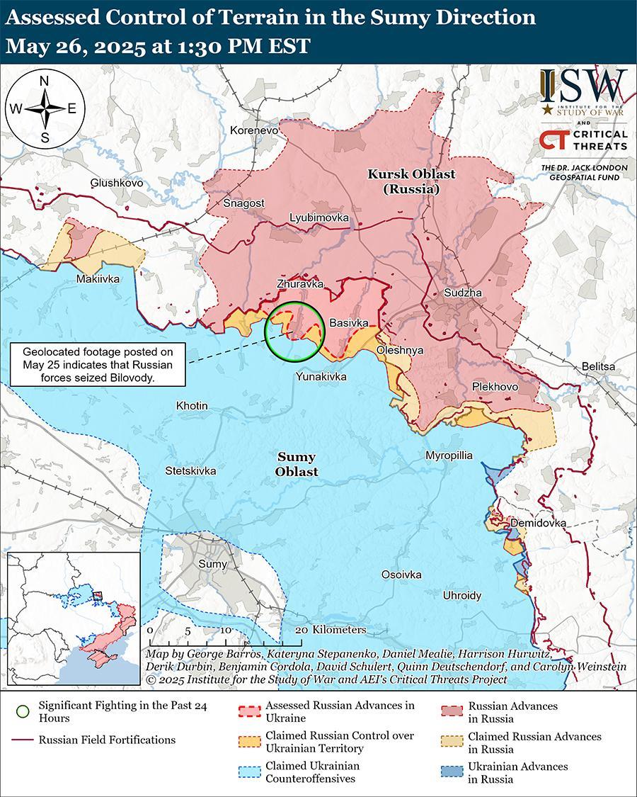 Оценка российского наступления: геолоцированные кадры, опубликованные 25 мая, указывают на то, что российские войска, как сообщается, подразделения 83-й воздушно-десантной бригады (ВДВ), продвинулись в южную часть Беловод (к северо-востоку от города Сумы) и, вероятно, захватили населенный пункт. [44]