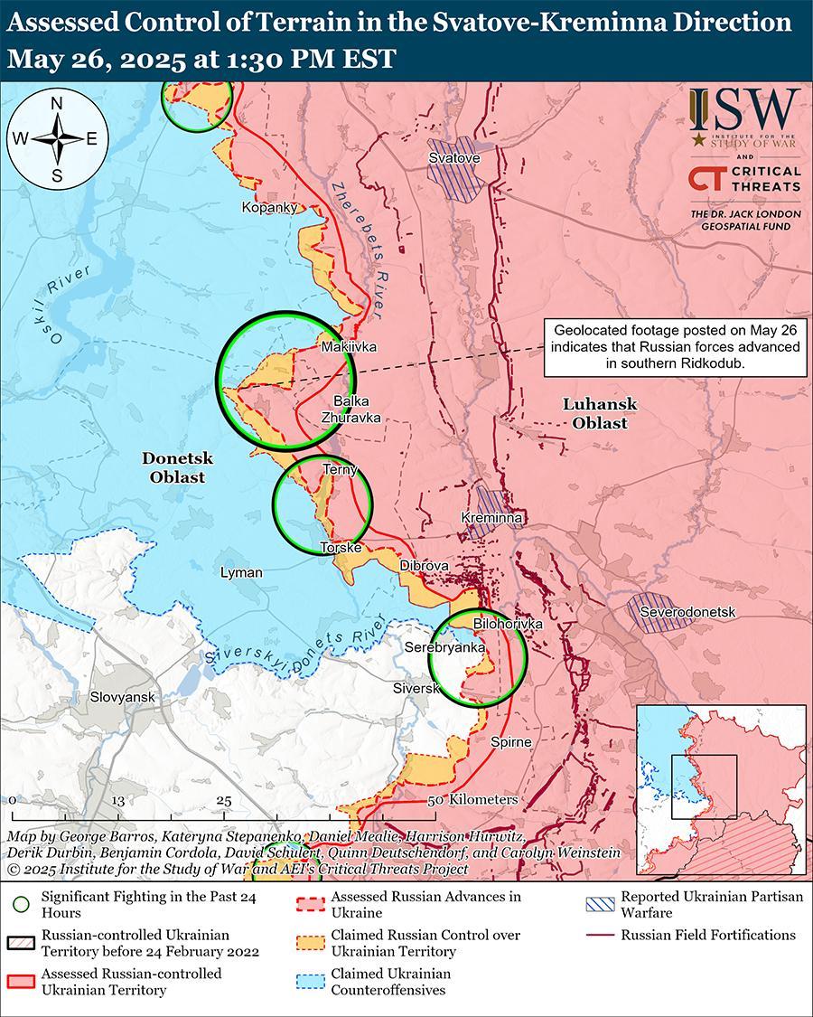 Враг продолжил наступательные действия к северу от Лимана в районах населенных пунктов Редкодуб, Липовое, Карповка, Новый Мир и Зеленая Долина; к северо-востоку от Лимана в районе Новомихайловки и Ямполовки; и восточнее Лимана в районе Торского и Серебрянского лесничества 25 и 26 мая. [62]