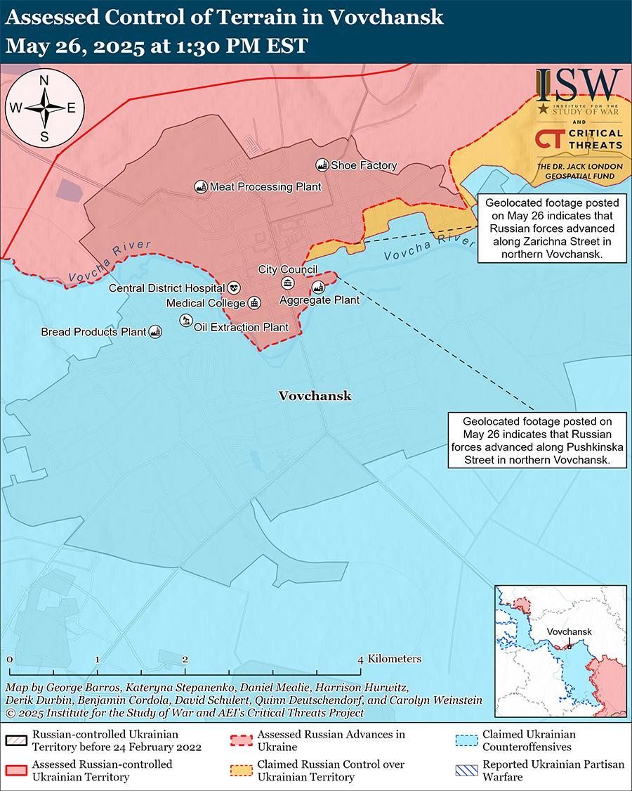 Оценка российского продвижения: геолоцированные кадры, опубликованные 26 мая, указывают на то, что российские войска недавно продвинулись в северном Волчанске (к северо-востоку от Харькова) и, вероятно, захватили Волчанский агрегатный завод. [52]