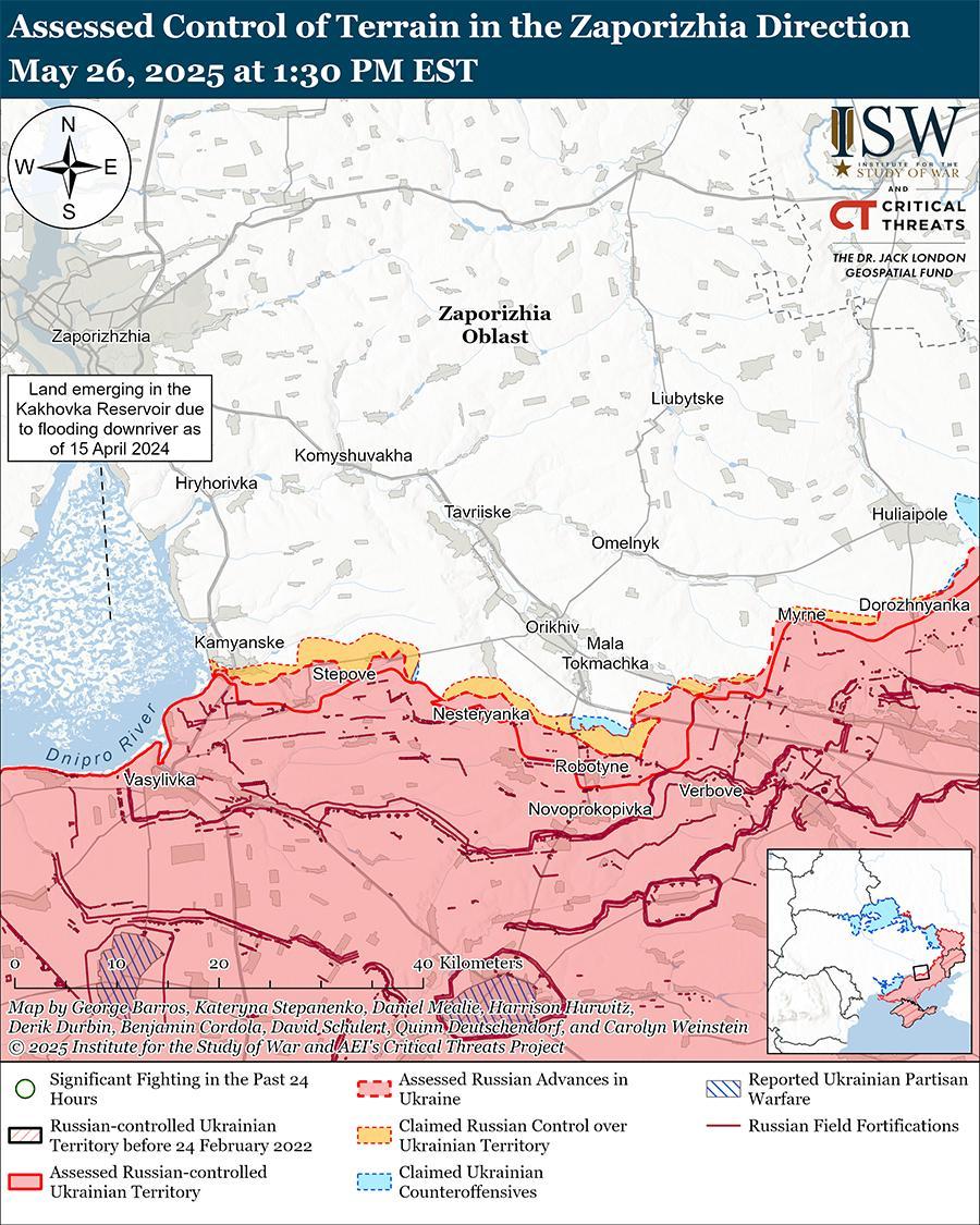 25 и 26 мая российские войска атаковали к юго-западу от Орехова в районе Новоандреевки и Степного, а также в направлении Малых Щербаков. [105]