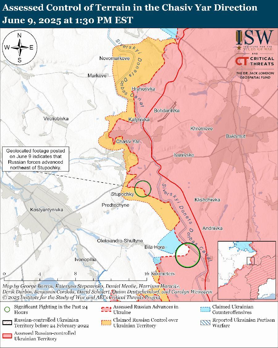 Оценка российского продвижения: геолоцированные кадры, опубликованные 9 июня, указывают на то, что российские войска недавно продвинулись в промышленной зоне к северо-востоку от Ступочки (к югу от Часова Яра). [61]