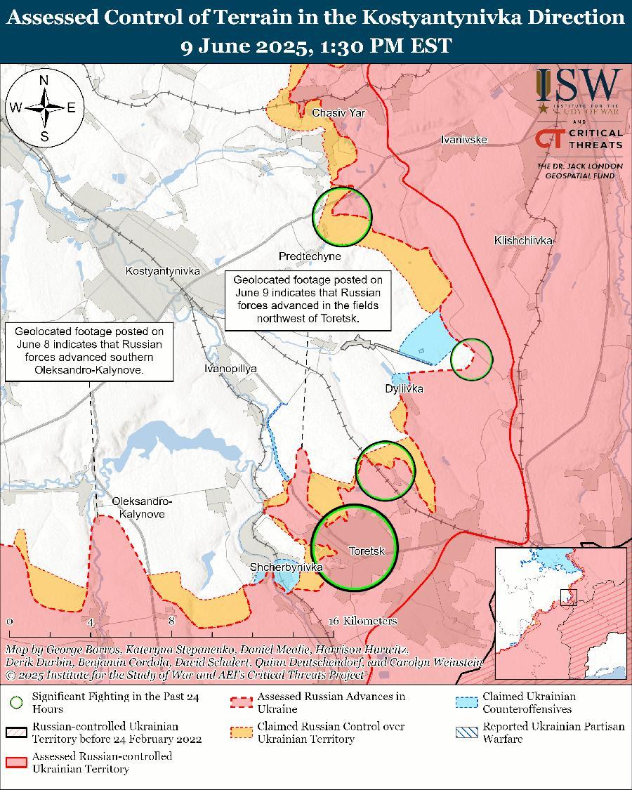 Оценка российского продвижения: геолоцированные кадры, опубликованные 9 июня, указывают на то, что российские войска недавно продвинулись к северо-западу от Торецка. [66] Геолоцированные кадры, опубликованные 8 июня, указывают на то, что российские войска недавно продвинулись в южную часть Александро-Калиново (к западу от Торецка), но неясно, сохраняют ли российские войска устойчивые позиции в этом районе. [67]