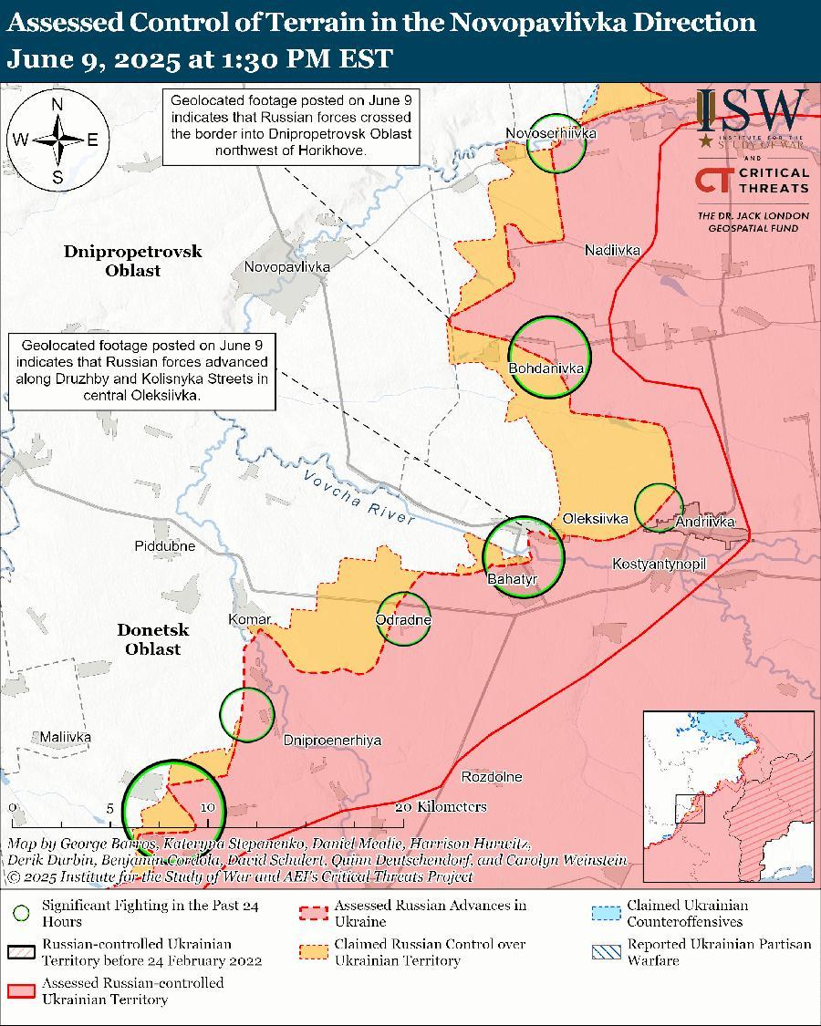 Российские войска недавно продвинулись к административной границе между Днепропетровской и Донецкой областями, поскольку кремлевские чиновники продолжали демонстрировать, что у России есть более широкие территориальные амбиции в Украине, выходящие за рамки Луганской, Донецкой, Запорожской, Херсонской областей и Крыма. Геолоцированные кадры, опубликованные 9 июня, указывают на то, что российские войска недавно продвинулись к административной границе Днепропетровской и Донецкой областей к северо-западу от Гороховое (к юго-востоку от Новопавловки). [1] Министерство обороны России 9 июня заявило, что Центральная группировка войск России захватила дополнительные территории в неуказанных районах Днепропетровской области. [2] 8 и 9 июня российские военные блогеры утверждали, что российские войска, в том числе части 90-й танковой дивизии (41-я общевойсковая армия, Центральный военный округ), ведут бои вблизи и за пределами границы Донецкой и Днепропетровской областей. [3] Пресс-секретарь Кремля Дмитрий Песков заявил 9 июня, что Россия начала наступление на Днепропетровскую область «в рамках создания буферной зоны» в Украине. [4] Первый заместитель председателя комитета Государственной Думы РФ по обороне Алексей Журавлев заявил, что Днепропетровская область сейчас находится в «сфере интересов» российских военных. [5] Председатель Комитета Совета Федерации по конституционному законодательству и государственному строительству Андрей Клишас заявил, что наступление России на Днепропетровскую область указывает на начало «денацификации» области Россией, ссылаясь на давнее требование России о смене режима в Украине. [6] Председатель комитета Госдумы по обороне Дмитрий Саблин заявил, что Россия «обязательно возьмет» Днепр и другие неуказанные украинские города, если Украина «не заключит мир на условиях [России]». [7] Российские официальные лица, вероятно, создают информационные условия для незаконного объявления Днепропетровской области аннексированной, как ранее оценивал ISW. [8] Кремлевские чиновники неоднократно давали понять, что Россия сохраняет территориальные амбиции за пределами четырех областей, которые Россия уже незаконно аннексировала, а министр иностранных дел России Сергей Лавров еще 9 июня повторил давнее заявление Кремля о том, что Одесса является «российским» городом. [9] Заместитель главы Офиса президента Украины полковник Павел Палиса 5 июня заявил, что Россия, вероятно, стремится оккупировать всю территорию Украины на восточном (левом) берегу Днепра, включая часть Днепропетровской области, и захватить Одесскую и Николаевскую области до конца 2026 года. [10] ISW продолжает считать, что Россия не заинтересована в мирных переговорах с Украиной и что Россия готовится к затяжной войне, чтобы добиться дальнейших успехов на поле боя. [11]