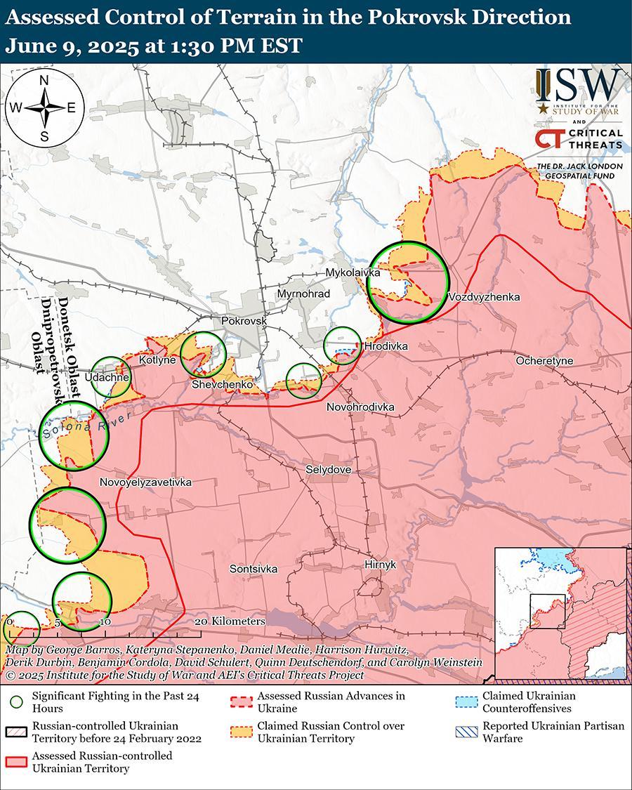 Враг продолжил наступательные действия к северо-востоку от Покровска в районах населенных пунктов Малиновка и Мирное, в направлении Новоэкономичного; к востоку от Покровска в районе Миролюбовки, Елизаветовки, Николаевки и Проминя; юго-восточнее Покровска в районе Лысовки; и юго-западнее Покровска в районе Удачного и Зверево 8 и 9 июня. [77]
