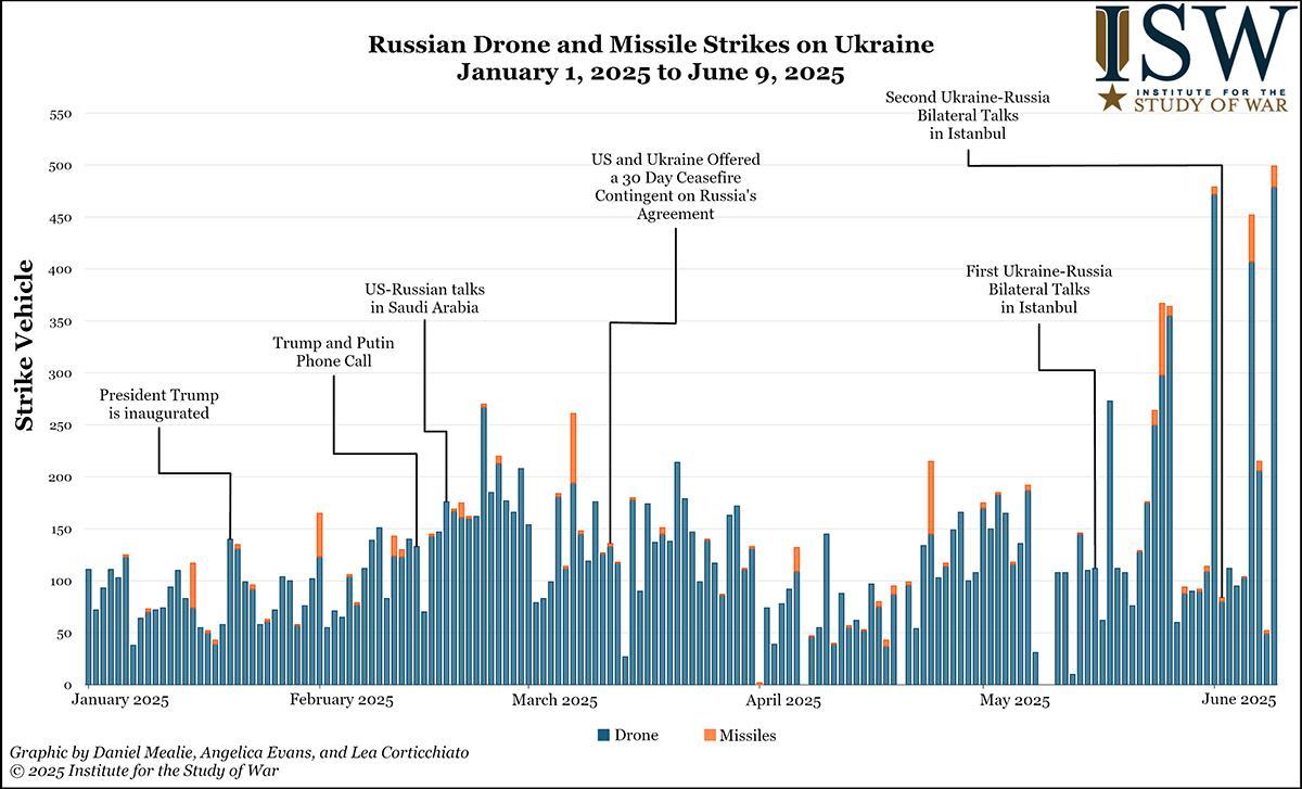 Официальный представитель Воздушных сил Украины полковник Юрий Игнат заявил 9 июня, что российские войска продолжают адаптировать свои ударные пакеты против Украины, используя большое количество беспилотников для сокрушения украинских систем ПВО и отвлечения внимания от последующих запусков крылатых и баллистических ракет. [21] Министерство обороны России заявило, что серия ударов 8–9 июня была частью ответа России на украинскую операцию «Паутина» — серию ударов с использованием беспилотников большой дальности по российским авиабазам 1 июня.[22] ISW, в частности, отметила значительное увеличение масштабов российских ударов с использованием беспилотников и ракет по Украине до начала операции «Паутина».[23]