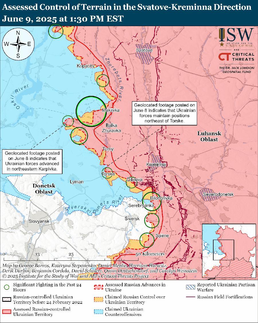 Оценка украинского продвижения: геолоцированные кадры, опубликованные 8 июня, указывают на то, что украинские войска недавно продвинулись к северо-востоку от Карповки (к северу от Лимана) и Торского (к востоку от Лимана). [57]