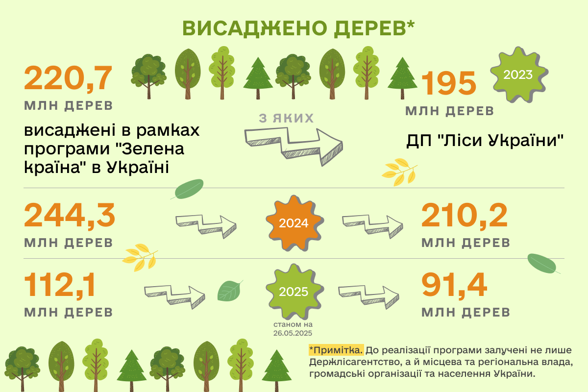 Наразі вже висаджено 821,5 млн шт. нових дерев, що становить 82,1% від запланованого, свідчать дані сайту “Зелена країна“.