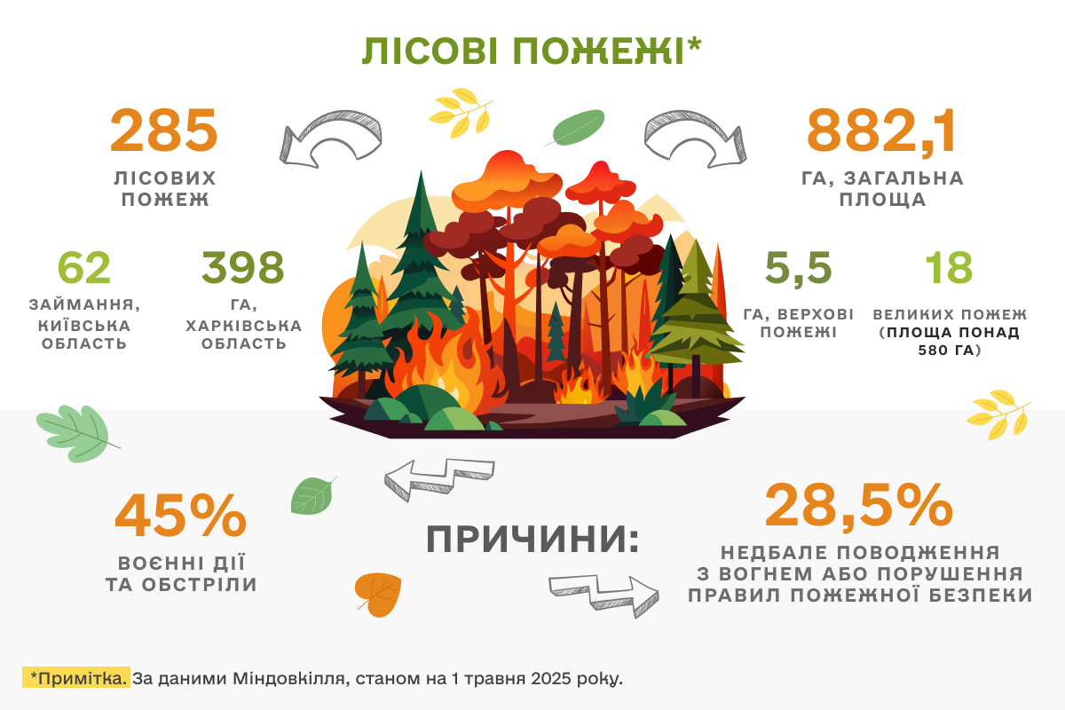За даними Міндовкілля, станом на 1 травня 2025 року в лісах Держлісагентства зафіксовано 285 лісових пожеж. Загальна площа, пройдена вогнем, склала 882,1 гектара, з яких 5,3 гектара — це верхові пожежі. Водночас було зареєстровано 18 великих пожеж, площа яких становить понад 580 гектарів. Найбільше випадків зафіксовано в Київській області — 62 займання. Найбільша площа ураження — в Харківській області: майже 398 гектарів, попри меншу кількість загорянь (39 випадків).