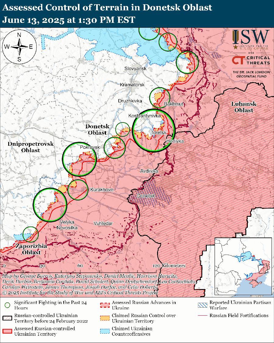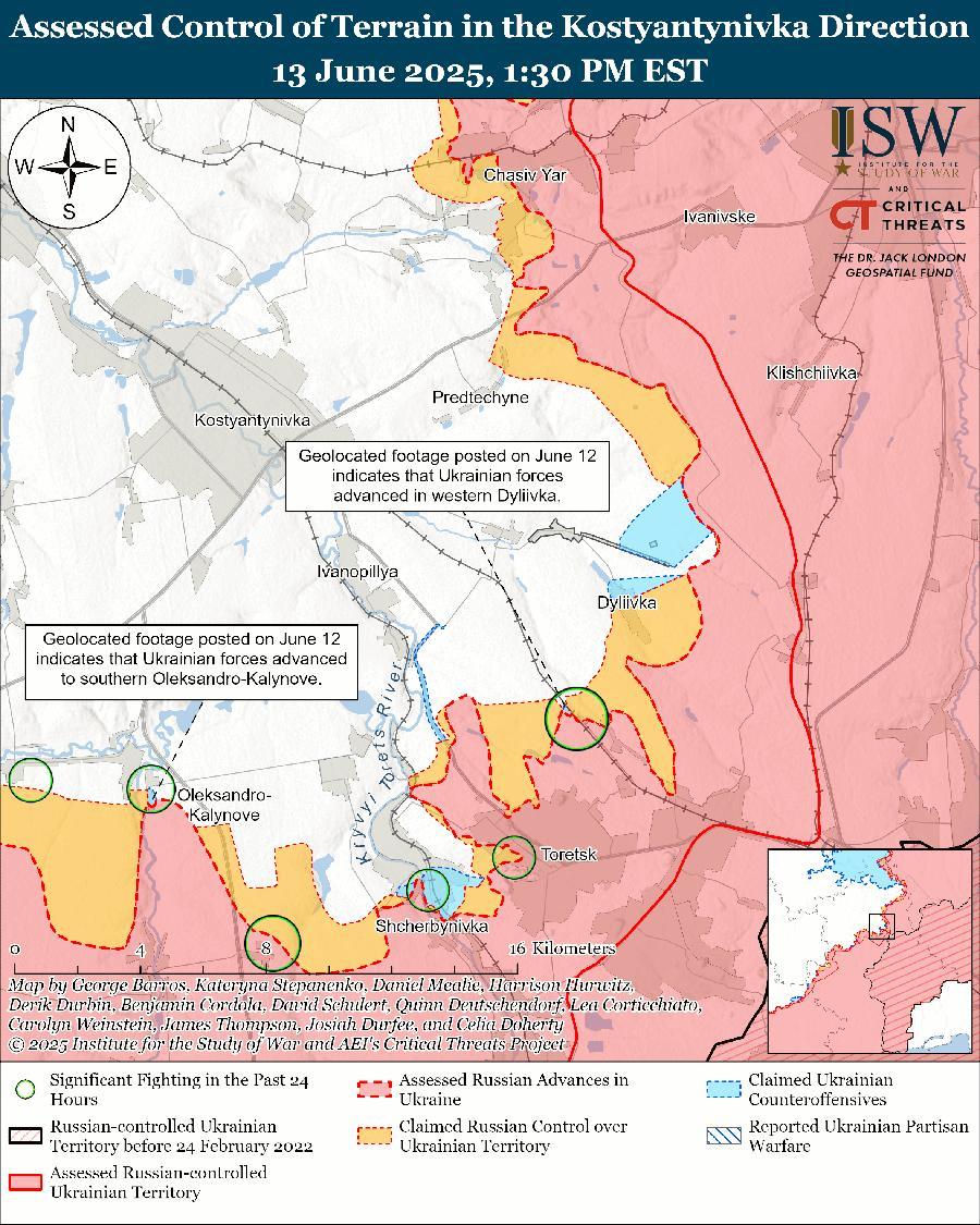 Оценка украинского продвижения: геолоцированные кадры, опубликованные 12 июня, указывают на то, что украинские войска недавно отбили позиции на севере Дилиевки (к северу от Торецка) и на юге Александро-Калиново (к западу от Торецка). [50]