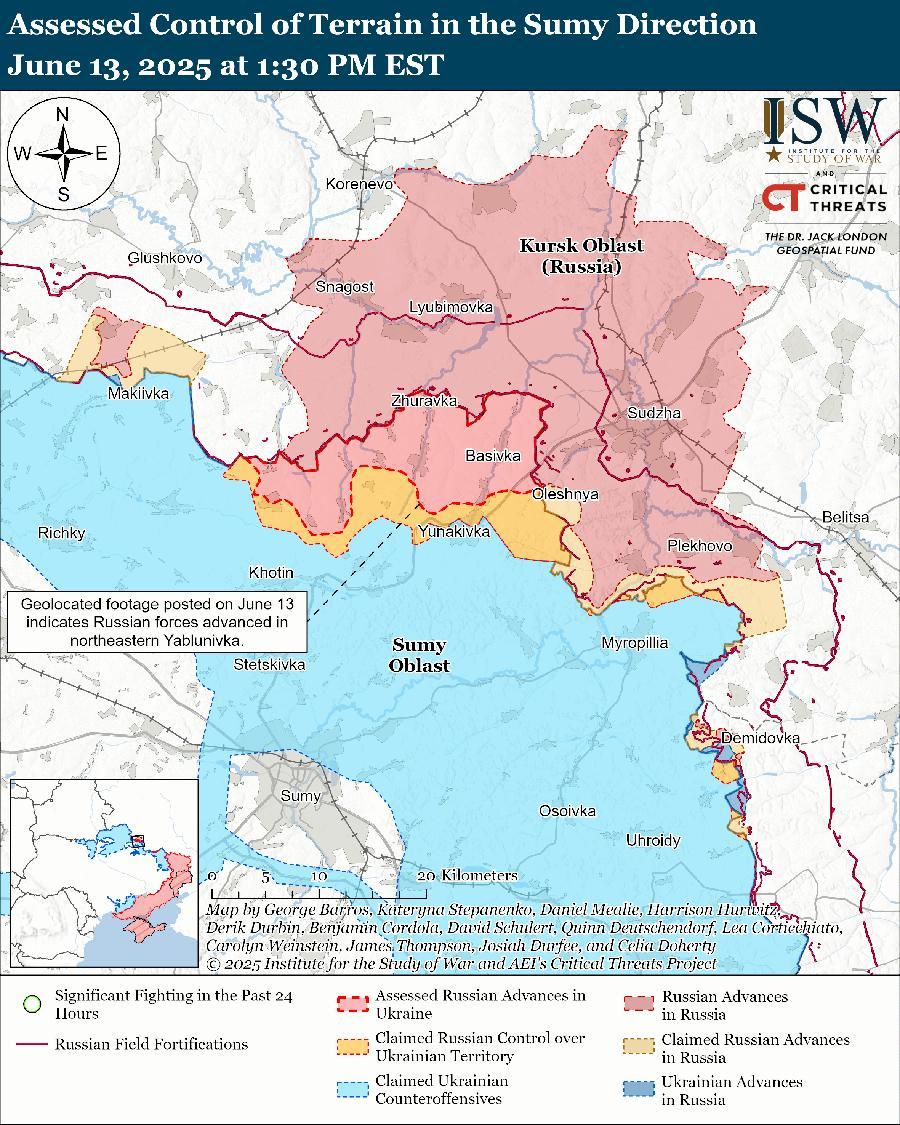 Оценка российского продвижения: Геолоцированные кадры, опубликованные 13 июня, указывают на то, что российские войска продвинулись в северо-восточной части Яблоновки (к северо-востоку от Сум). [22]