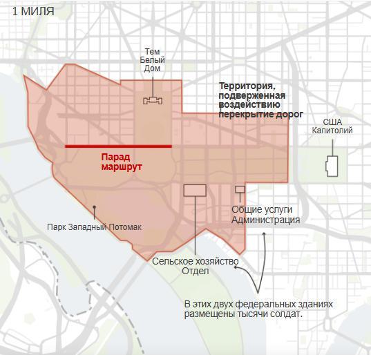 Тысячи солдат пройдут маршем от Пентагона в Арлингтоне, штат Вирджиния, до Вашингтона, в то время как тяжелая бронетехника медленно движется на север от парка Западный Потомак.