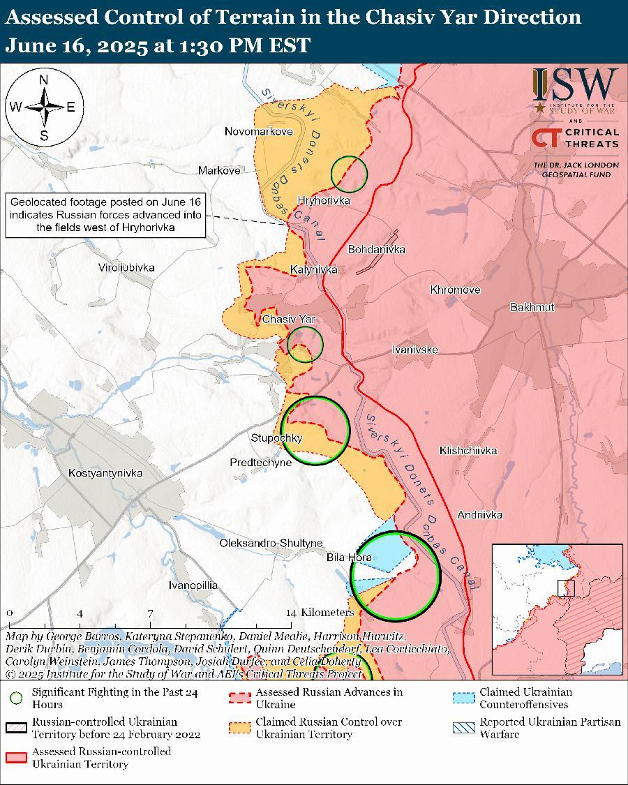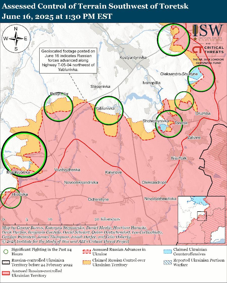 Оценка российского продвижения: геолоцированные кадры, опубликованные 16 июня, указывают на то, что российские войска недавно продвинулись вдоль трассы Т-0504 Покровск-Константиновка к северо-западу от Яблоновки (к северо-западу от Торецка) и в западной части Яблоновки. [51]