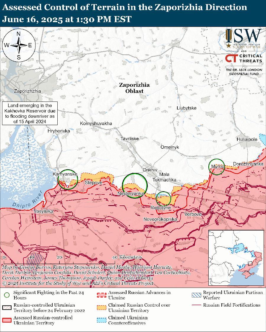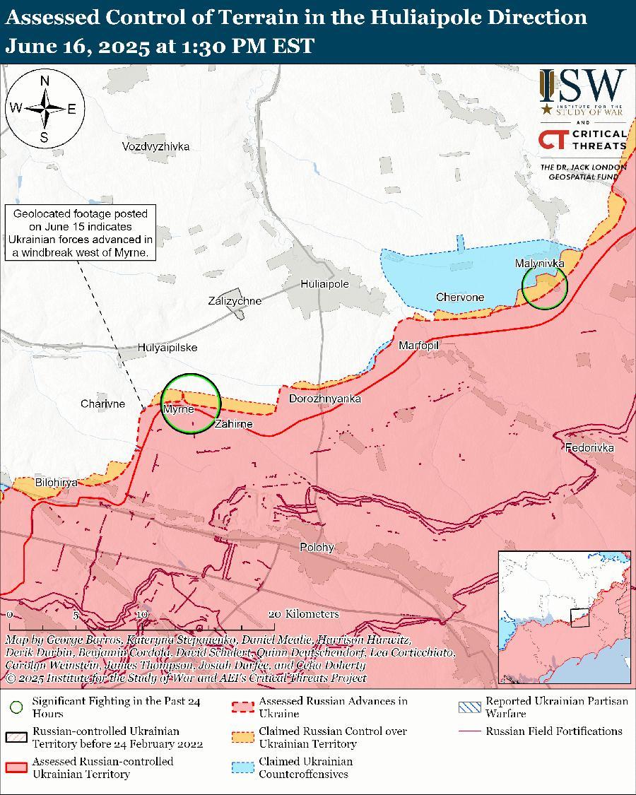Оценка украинского продвижения: геолоцированные кадры, опубликованные 15 июня, указывают на то, что украинские войска в последнее время незначительно продвинулись к западу от Мирного (к востоку от Орехова). [78]