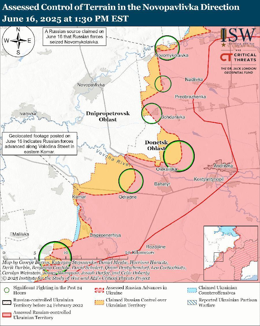 Оценка российского продвижения: геолоцированные кадры, опубликованные 16 июня, указывают на то, что российские войска недавно продвинулись в восточной части Комара (к югу от Новопавловки). [63]
