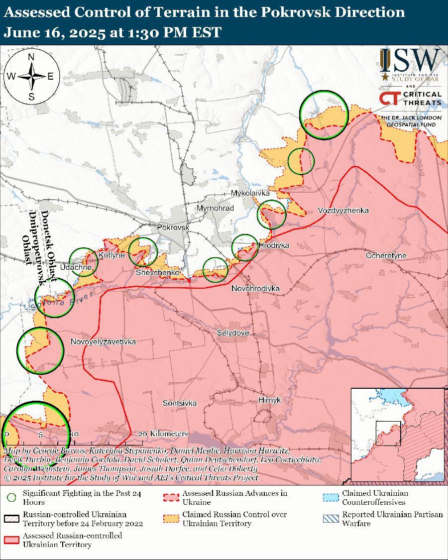 Российские войска атаковали под самим Покровском; северо-восточнее Покровска в районе Малиновки, Мирного, Коптево и Шевченко Первого; восточнее Покровска в районе Миролюбовки и Проминя и в направлении Николаевки; юго-восточнее Покровска в районе Лысовки; и юго-западнее Покровска в районе Удачного 15 и 16 июня. [57]