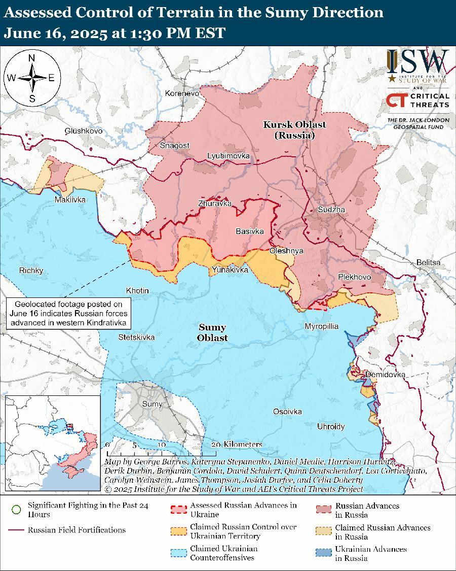 Оценка российского продвижения: на геолоцированных кадрах, опубликованных 16 июня, видно, как украинские войска наносят удары по российским позициям на юго-западе Кондратовки (к северу от Сум), что указывает на то, что российские войска недавно захватили населенный пункт. [27]