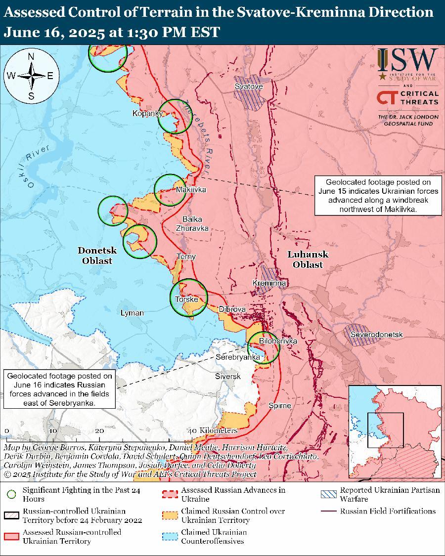 Оценка украинского продвижения: геолоцированные кадры, опубликованные 15 июня, указывают на то, что украинские войска недавно продвинулись к северо-западу от Макеевки (к юго-востоку от Боровой). [39]
