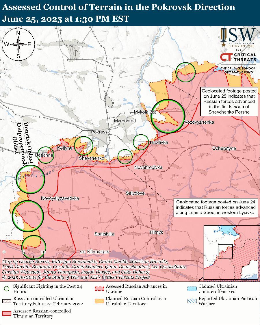 Оценка российского продвижения: геолоцированные кадры, опубликованные 24 июня, указывают на то, что российские войска недавно продвинулись к северу от Шевченко Первого (к северо-востоку от Покровска) и к западу от Лысовки (к юго-востоку от Покровска). [66]