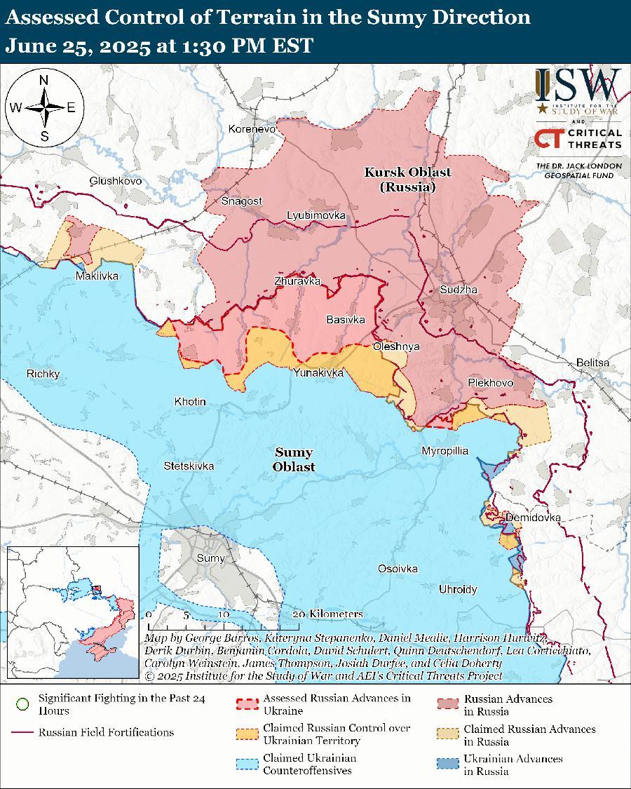 Госсекретарь США Марко Рубио правильно заявил, что Россия не продемонстрировала готовности двигаться вперед в мирных переговорах. Рубио заявил в интервью Politico, опубликованном 25 июня, что Россия пытается «достичь на поле боя того, чего [Россия] требует за столом переговоров», включая «контроль над определенными территориями», но отметил, что эта цель будет более трудной для достижения, чем Россия в настоящее время считает.[7] Рубио заявил, что с января 2025 года Россия потеряла более 80 000 убитыми в бою, но что Путин тем не менее продолжает «подпитывать военную машину» и что Россия «не продемонстрировала готовности двигаться вперед» в мирных переговорах. Заявления Рубио согласуются с оценками ISW о том, что Россия пытается затянуть переговорный процесс и затянуть войну, чтобы обеспечить дополнительные территориальные приобретения.[8] Максималистские требования России к переговорам по украинской территории, включая значительные площади территории, которые Россия в настоящее время не оккупирует, представляют собой информационную тактику, призванную заставить территориальными уступками компенсировать достижения, которых Россия не может добиться на поле боя. ISW продолжает оценивать, что Россия не желает участвовать в существенных переговорах по прекращению войны в Украине любым способом, который не соответствует максималистским требованиям России, которые оставались неизменными с момента начала полномасштабного вторжения.[9]