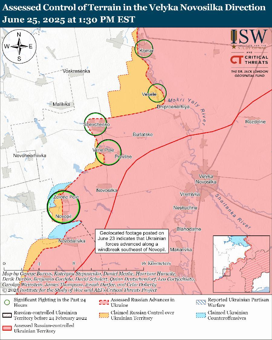 Оценка украинского продвижения: геолоцированные кадры, опубликованные 23 июня, указывают на то, что украинские войска недавно продвинулись к юго-востоку от Новополя (к юго-западу от Великой Новоселки). [80]