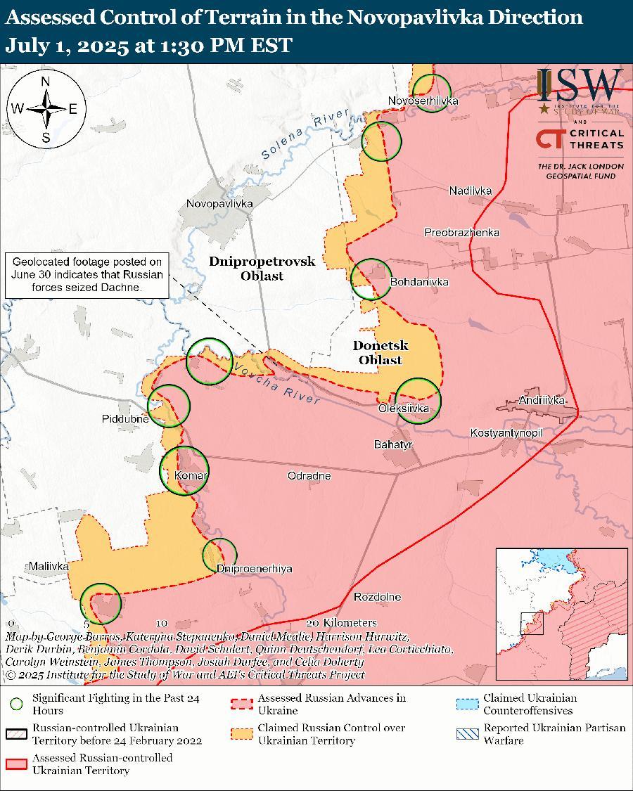 Оценка продвижения российских войск: геолоцированные кадры, опубликованные 30 июня, указывают на то, что российские войска недавно продвинулись в северном Дачном (к югу от Новопавловки в Днепропетровской области) и захватили населенный пункт. [72]