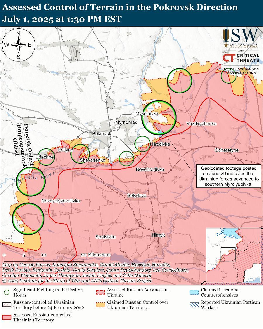 Оценка украинского продвижения: геолоцированные кадры, опубликованные 29 июня, указывают на то, что украинские войска недавно продвинулись в южной части Миролюбовки (к востоку от Покровска). [64]