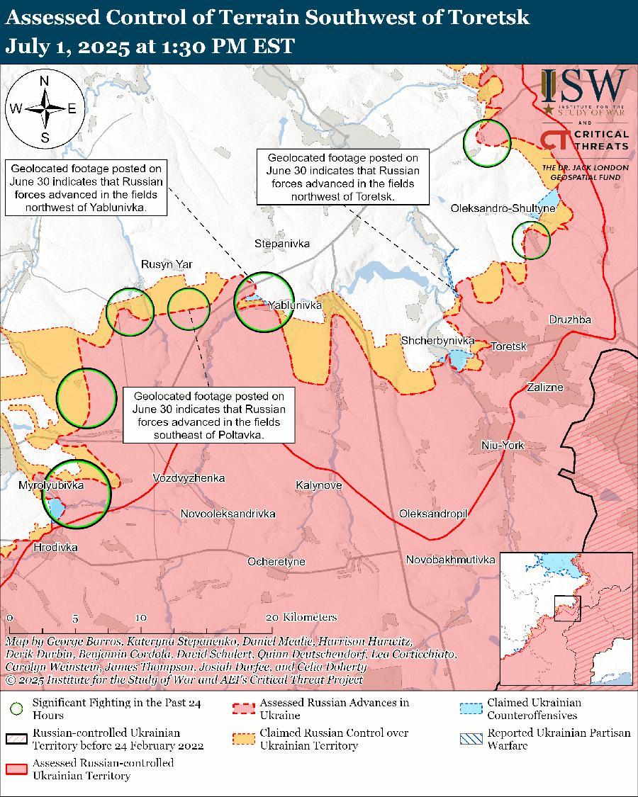 Оценка российского продвижения: геолоцированные кадры, опубликованные 30 июня, указывают на то, что российские войска недавно продвинулись к северо-западу от Торецка, к юго-востоку от Полтавки и к северо-западу от Яблоновки (оба к северо-западу от Торецка). [56]