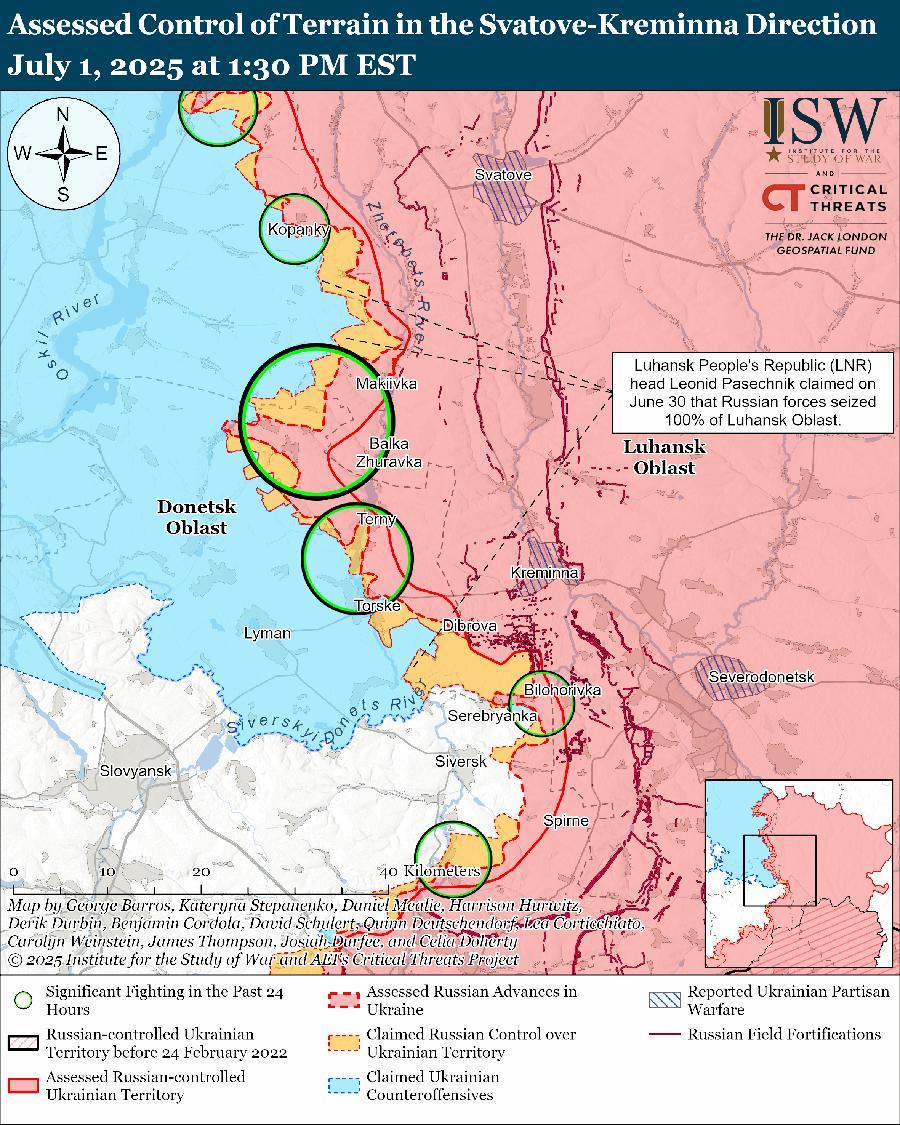 Российский оккупационный чиновник заявил, что российские войска во второй раз захватили всю Луганскую область за время полномасштабного вторжения России, но российские военные блогеры опровергли это утверждение. Глава Луганской Народной Республики (ЛНР) Леонид Пасечник 30 июня заявил, что российские войска захватили всю Луганскую область. [1] Однако российские военные блогеры опровергли заявление Пасечника, заявив, что российские войска не зачистили Надежду и Новоегоровку (оба населенных пункта к востоку от Боровой). [2] Один военный блогер заявил, что некоторые приграничные районы до сих пор являются спорными «серыми зонами». [3] Тогдашний министр обороны России Сергей Шойгу заявил 3 июля 2022 года, что российские войска захватили всю Луганскую область, но впоследствии украинские войска смогли вернуть позиции в Луганской области во время контрнаступления на Харьков осенью 2022 года. [4] Украинские войска продвинулись в Харьковской, Донецкой и Луганской областях в ходе контрнаступления осенью 2022 года и сорвали планы России по возобновлению усилий по продвижению на северной окраине «крепостного пояса» в Донецкой области. [5] С тех пор российским войскам не удалось вернуть значительные участки территории, освобожденные украинскими войсками в ходе Харьковского контрнаступления, включая Купянск, Боровую, Изюм и Лиман. В начале 2024 года российские войска активизировали наступательные действия на Купянском, Боровом и Лиманском направлениях и в течение последних полутора лет продолжают попытки продвижения к этим трем населенным пунктам. [6] По оценкам ISW в конце ноября 2024 года, российские войска захватили примерно 99 процентов территории Луганской области, и в течение семи месяцев российские войска изо всех сил пытались захватить последний процент. [7]