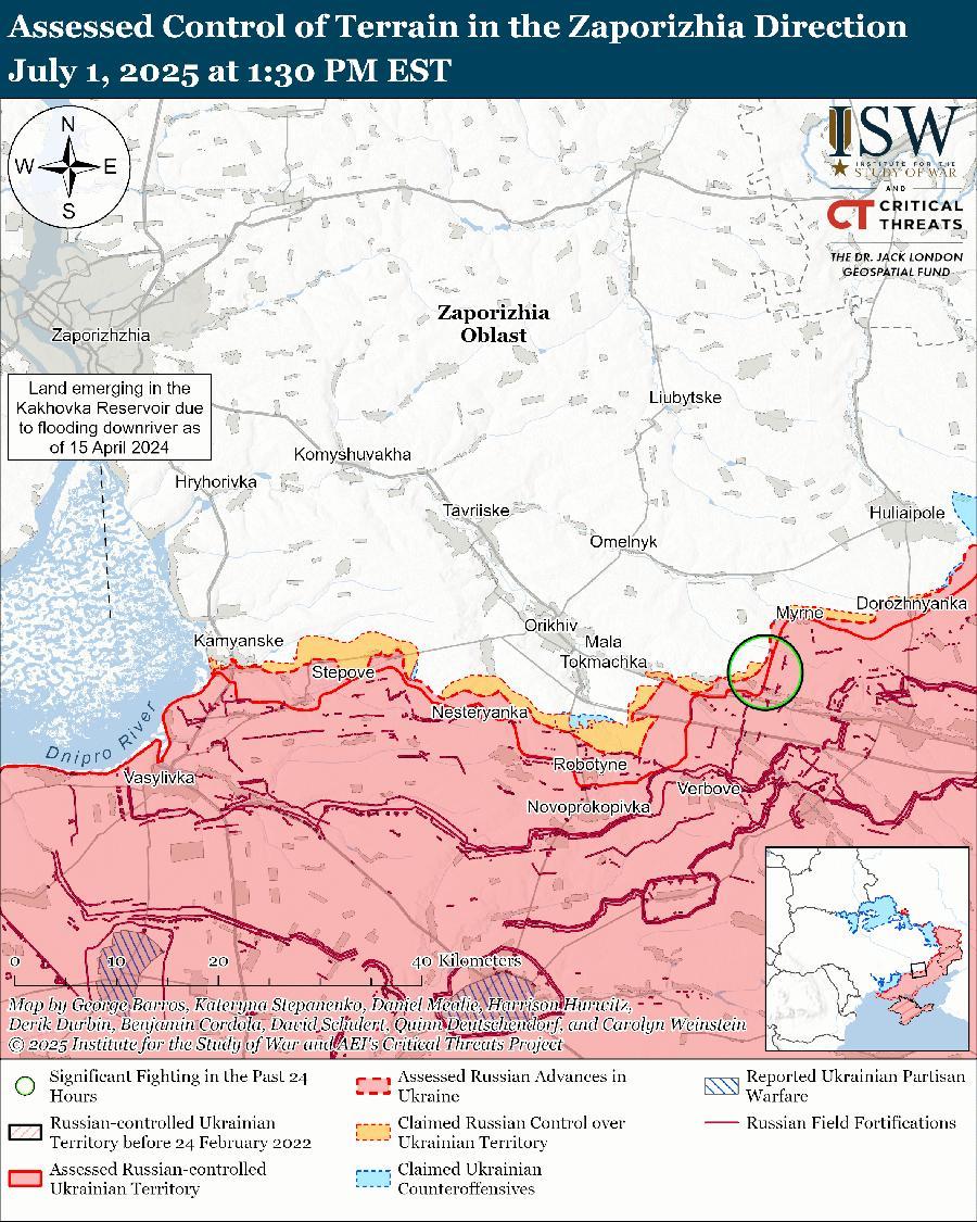 1 июля российские войска продолжили штурмовые действия на западе Запорожской области, но не продвинулись вперед.