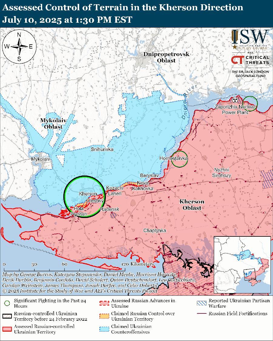 9 и 10 июля враг вел наземные наступления на Херсонском направлении, в том числе в направлении Приднепровского (к востоку от Херсона на западе [правобережье] Херсонской области) и острова Белогрудный (к юго-западу от Херсона). [101]