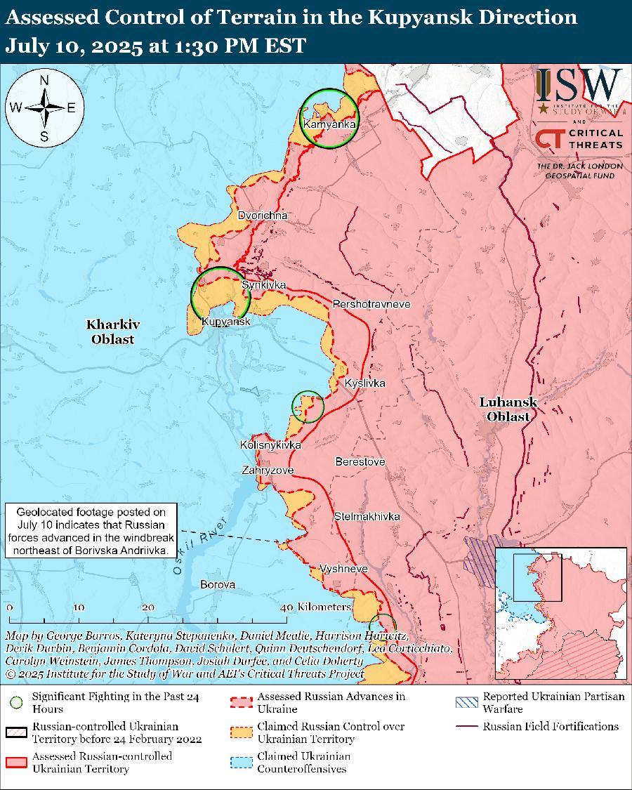 Оценка российского продвижения: геолоцированные кадры, опубликованные 10 июля, указывают на то, что российские войска недавно продвинулись к северо-востоку от Боровской Андреевки (к северо-востоку от Боровой). [55]