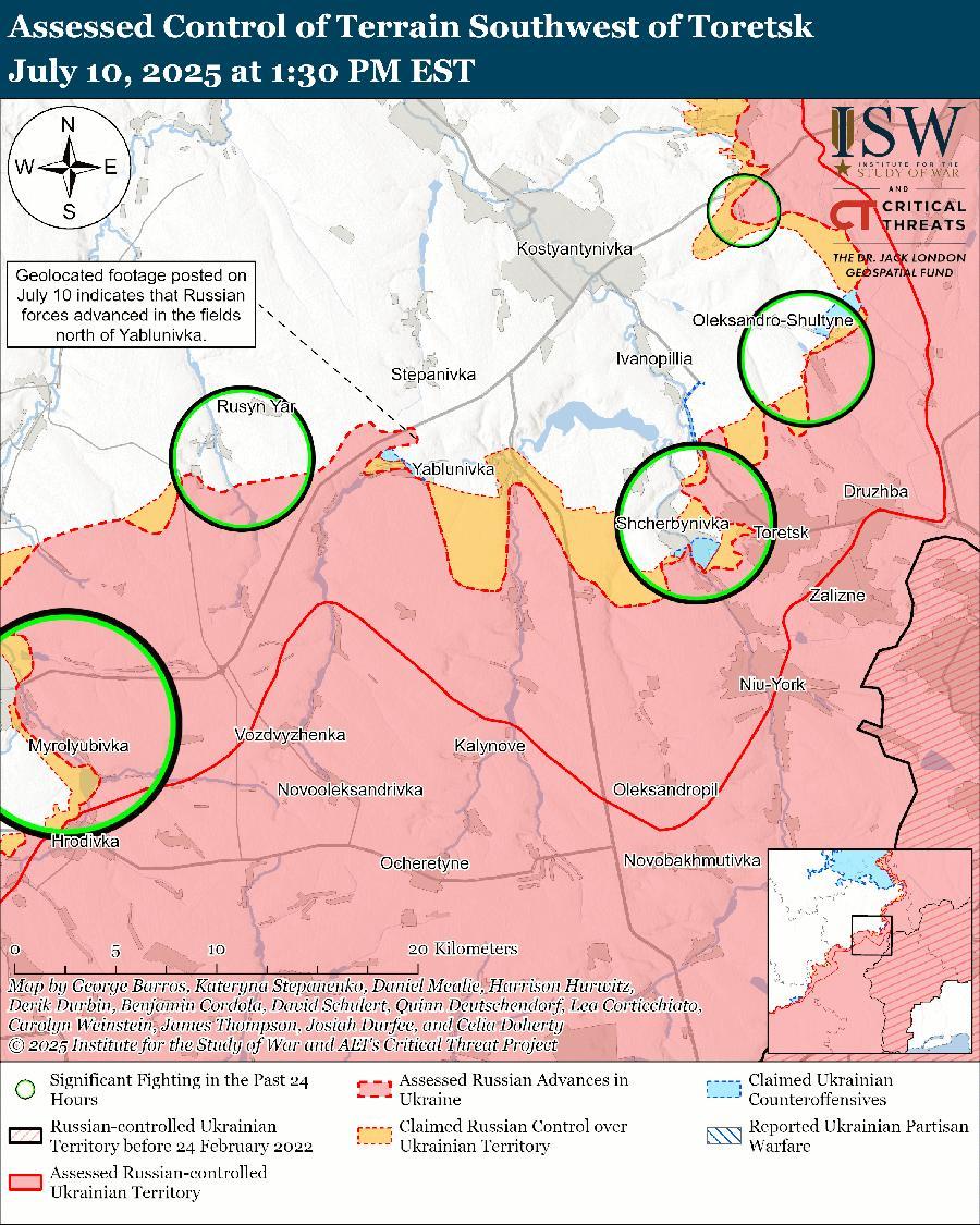 Оценка российского продвижения: геолоцированные кадры, опубликованные 10 июля, указывают на то, что российские войска продвинулись вдоль трассы Т-0504 Покровск-Константиновка к северу от Яблоновки (к северо-западу от Торецка). [71]