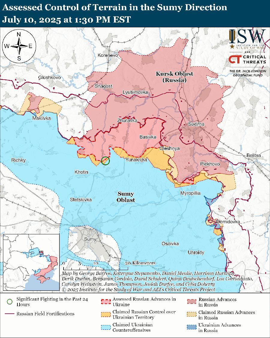 9 и 10 июля враг наносил удары в приграничной зоне Сумской области в районах населенных пунктов Рыжевка (к северо-западу от Сум) и Безсаловка. [39] Российские источники утверждали, что украинские войска контратаковали вблизи Безсаловки, Андреевки и Кондратовки (оба к северу от Сум). [40]