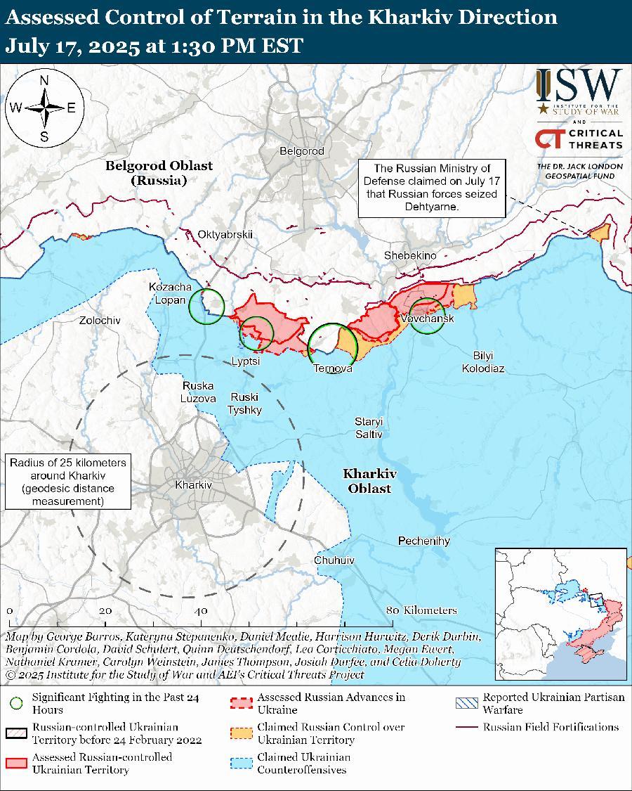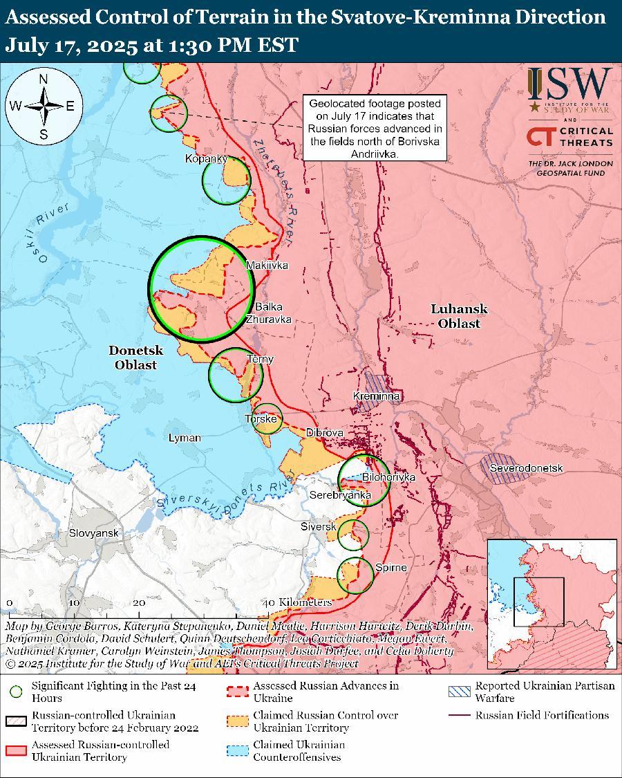 Оценка российского продвижения: геолоцированные кадры, опубликованные 17 июля, указывают на то, что российские войска недавно продвинулись к северо-востоку от Боровской Андреевки (к северо-востоку от Боровой). [45]