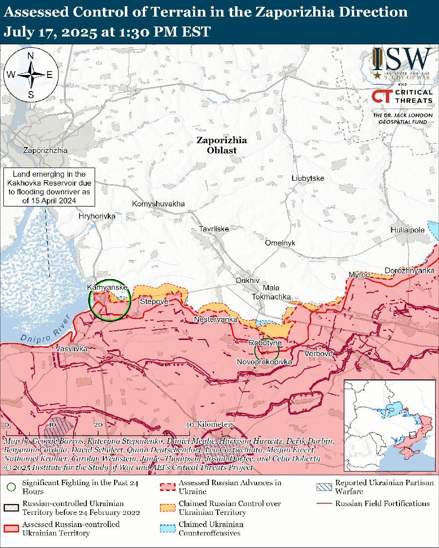 17 июля российские войска продолжили наземные наступления на западе Запорожской области, но не добились подтвержденных успехов.