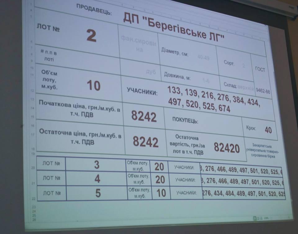 На аукціон було виставлено 195, 700тис. м3 необробленої деревини, з яких 171, 309 тис. м3 (88%) було реалізовано. У торгах взяли участь 487 вітчизняних покупця. Традиційно ажіотажний попит викликала реалізація деревини хвойних порід, де на кожен лот заявлялися від 5 і більше покупців. Також майже на 100% була викуплена сировина породи дуб і бук. 100% продано деревину, поставлену Виноградівським, Верхньогірським лісгоспами. Опісл лідерів місця розподілили між собою за реалізацією необробленої деревини Рахівський (99%), Великобичківський (98%), Перечинський (97%), Воловецький (96 %), Ясінянський, Тячівський та Міжгірський (по 95 %) держлісгоспи.