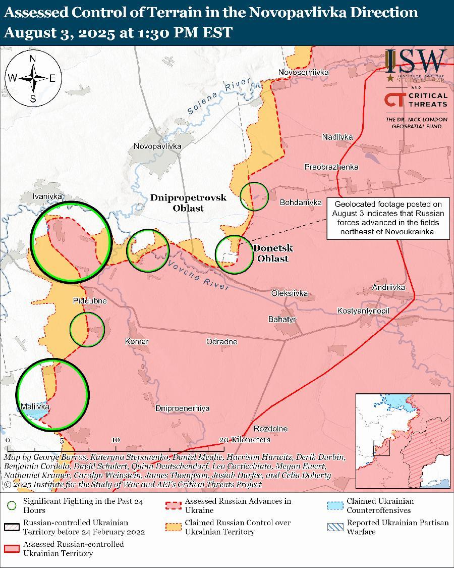 Оценка российского продвижения: геолоцированные кадры, опубликованные 3 августа, указывают на то, что российские войска недавно продвинулись к северо-востоку от Новоукраинки (к юго-востоку от Новопавловки). [66]