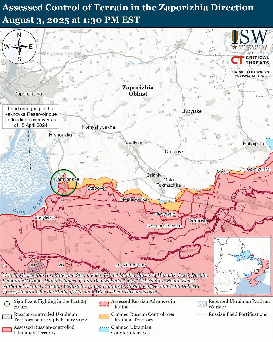 Оценка украинского продвижения: геолоцированные кадры, опубликованные 2 августа, указывают на то, что украинские войска недавно продвинулись в южной части Плавни (к западу от Орехова). [78]