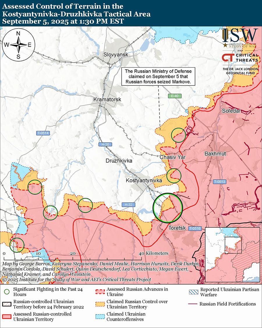 Неподтвержденные утверждения: министерство обороны России и российские источники заявили 5 сентября, что российские войска захватили Марково (к северо-востоку от Константиновки). [44] Другой российский военный блогер утверждал, что российские войска продвинулись к северу от Белой Горы (к юго-востоку от Константиновки). [45]