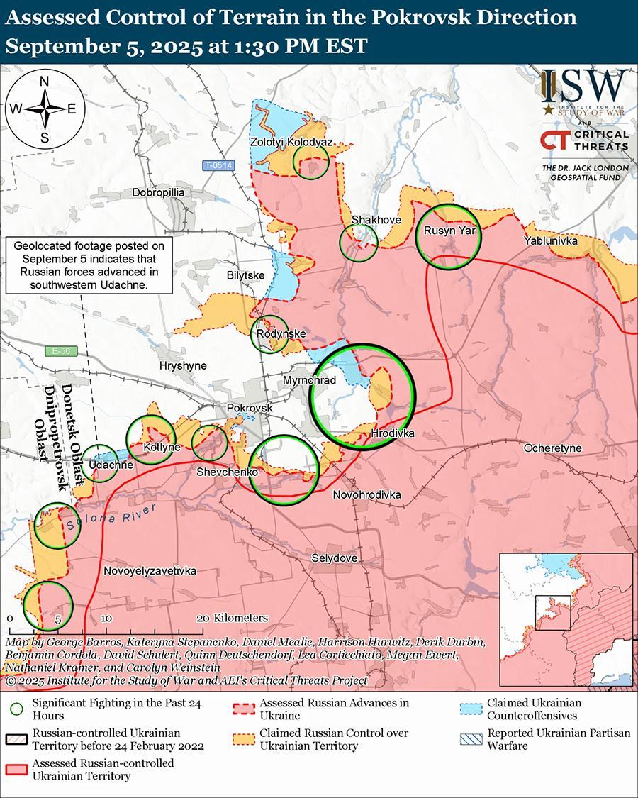 Оценка российского продвижения: геолоцированные кадры, опубликованные 5 сентября, указывают на то, что российские войска недавно продвинулись в юго-западном Удачном (к юго-западу от Покровска). [52]