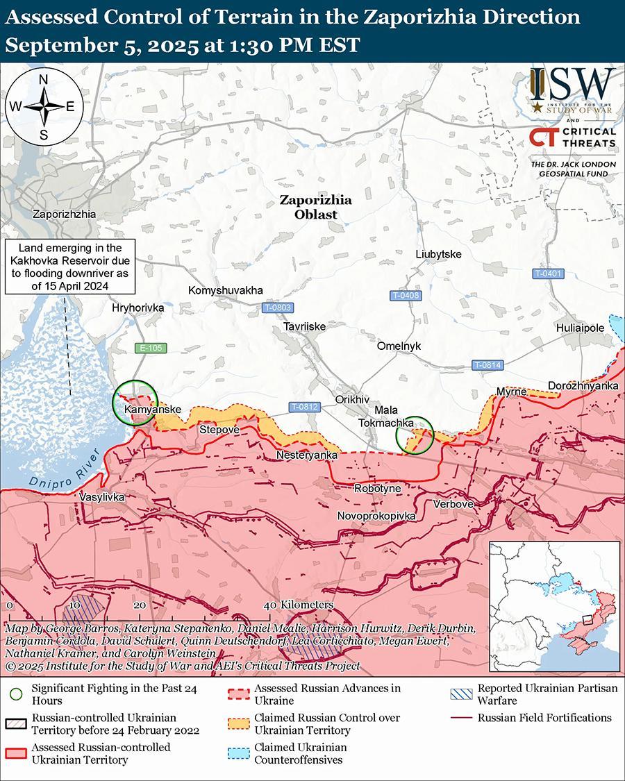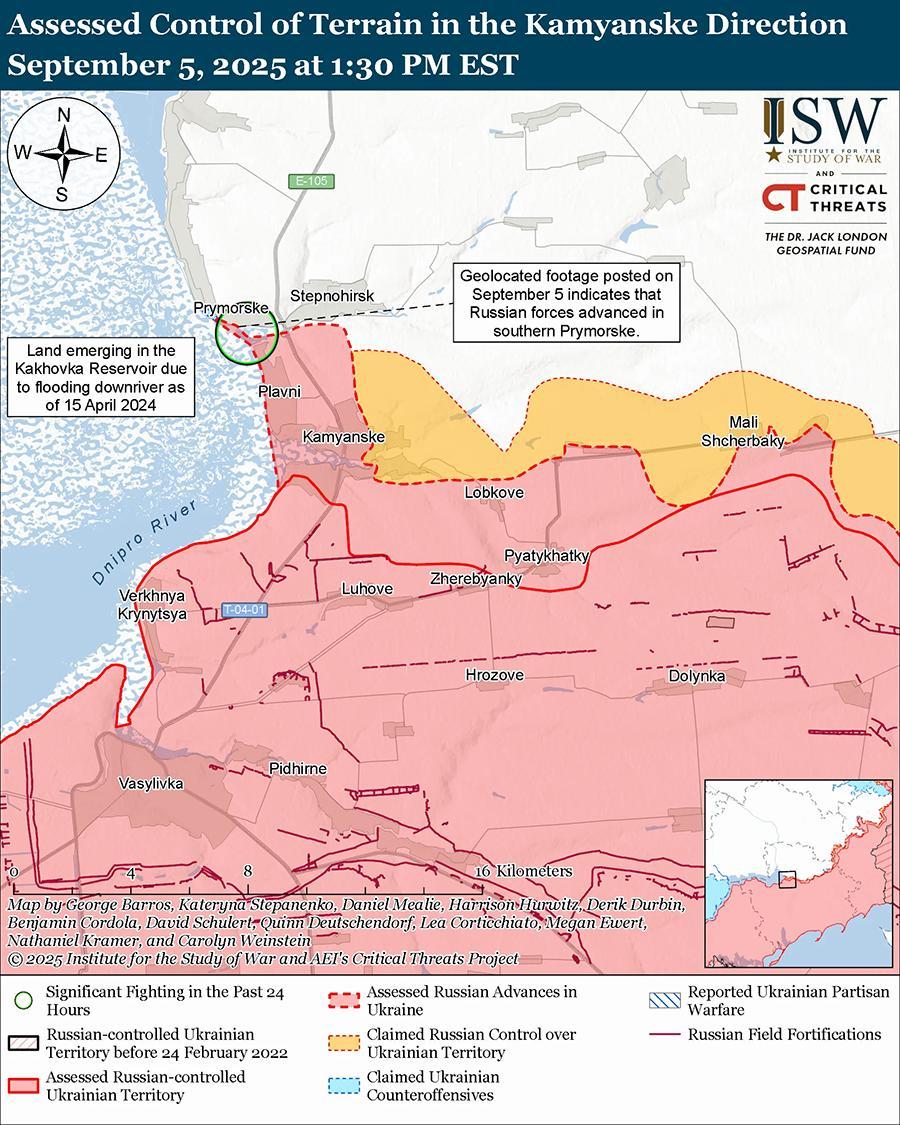 Оценка российского продвижения: геолоцированные кадры, опубликованные 5 сентября, указывают на то, что российские войска недавно продвинулись в южном Приморском (к северо-западу от Орехова). [65]