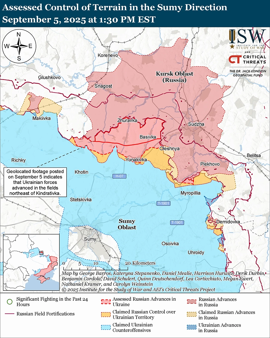 Оценка украинского продвижения: геолоцированные кадры, опубликованные 5 сентября, указывают на то, что украинские войска недавно продвинулись к северо-востоку от Кондратовки (к северу от Сум). [22]