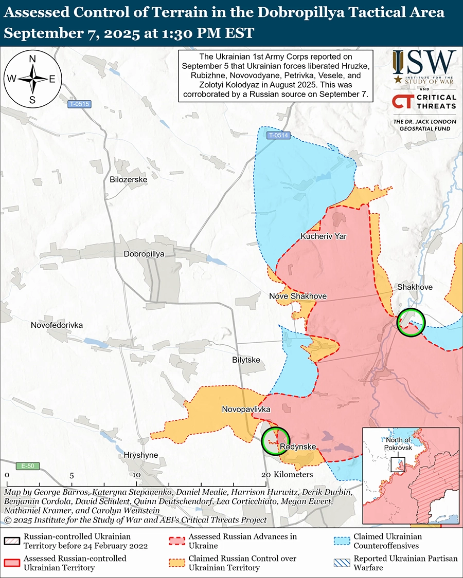 Оценка украинского продвижения: 5 сентября 1-й армейский корпус Украины сообщил, что в августе 2025 года украинские войска освободили Грузское, Рубежное, Нововодянное, Петровку, Веселое и Золотой Колодязь (все к северо-востоку от Доброполья), а 7 сентября российский военный блогер опубликовал карту, на которой видно, что украинские войска освободили Грузское, Веселое, Золотой Колодязь, Рубежное и Степи (бывшая Кутузовка, к востоку от Доброполья). [61]