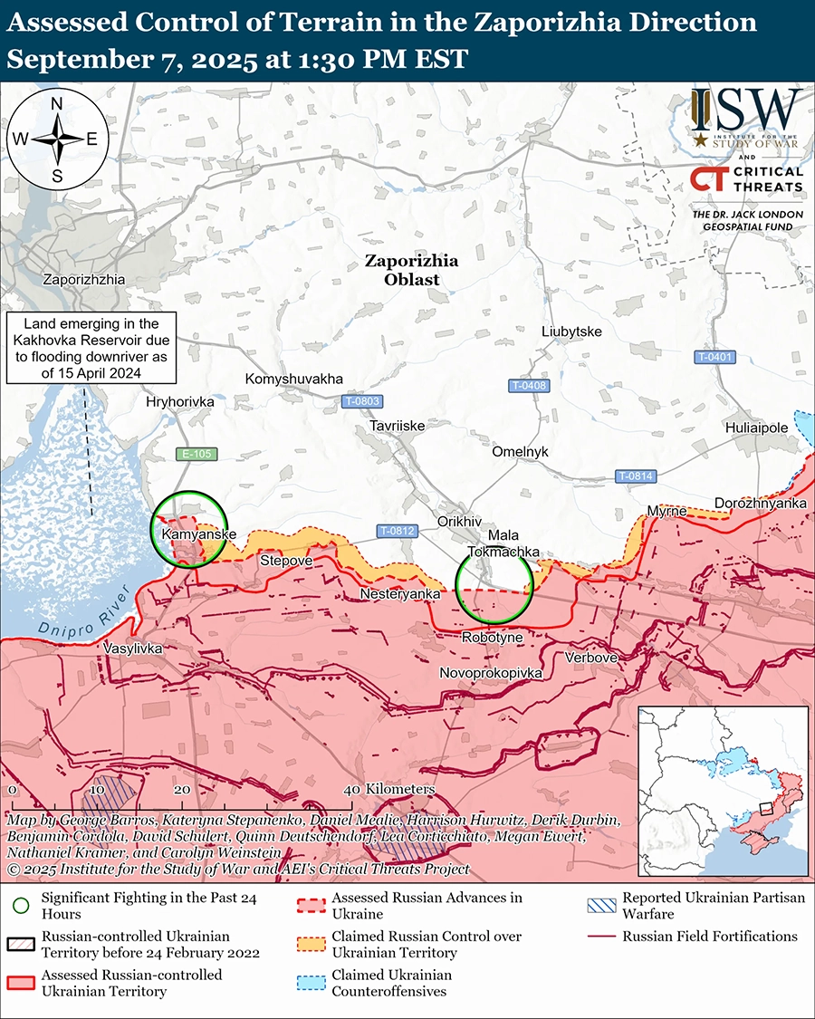 Ни украинские, ни российские источники не сообщали о наземных действиях на востоке Запорожской области 7 сентября.