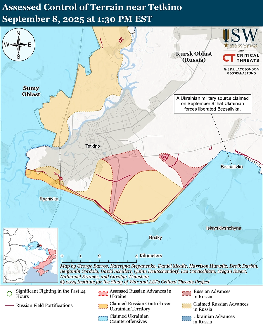 Оценка украинского продвижения: украинский военный обозреватель Константин Машовец 8 сентября заявил, что украинские войска отбили Безсаловку (к северо-западу от Сум). [19]
