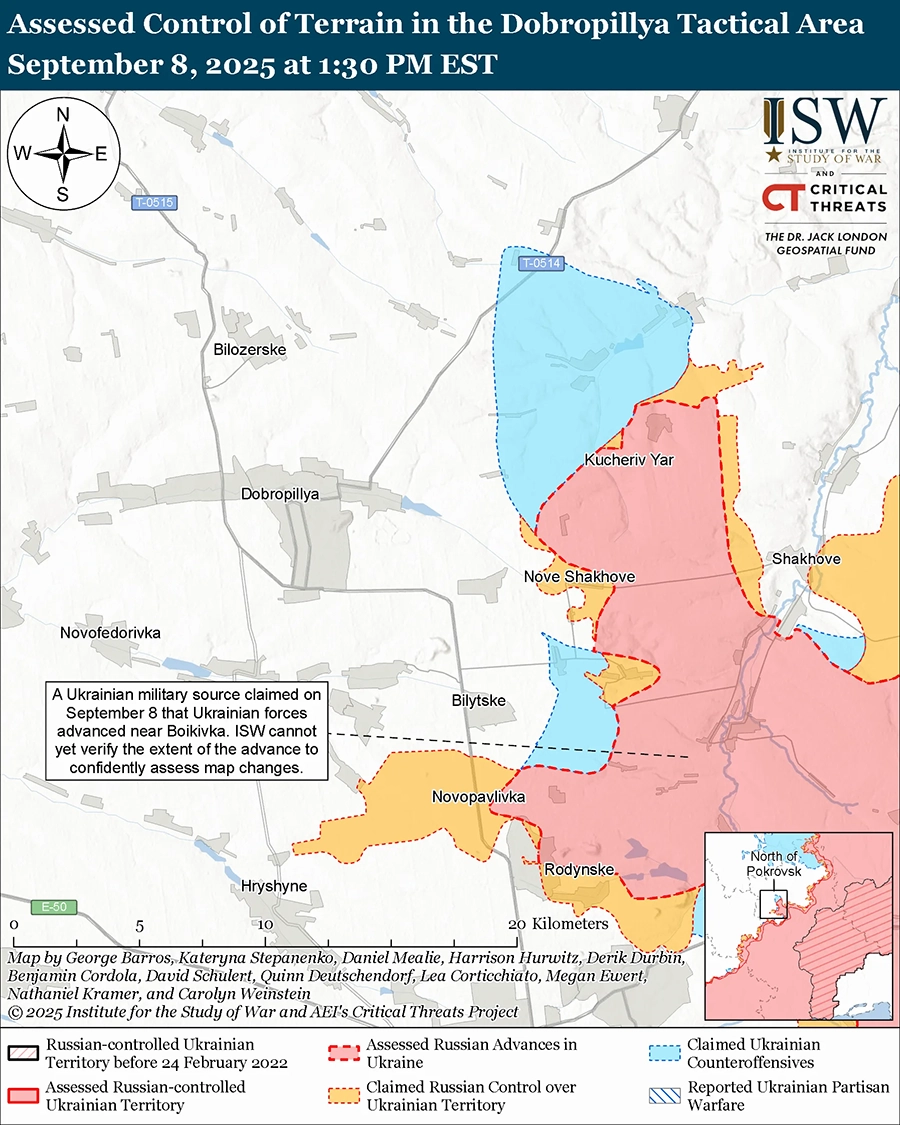 Российские войска атаковали вблизи и в самом Покровске; севернее Покровска в районе Родинского и Красного Лимана; восточнее Покровска в районе Миролюбовки и Проминя и в направлении Новоэкономического; юго-восточнее Покровска в районе Лысовки; южнее Покровска в районе Новоукраинки и Новопавловки; и юго-западнее Покровска в районе Зверево, Котлино, Удачного и Молодецкого и в направлении Новопидгородного 7 и 8 сентября. [61] Машовец сообщал, что украинские войска контратакуют в районе Удачного. [62]